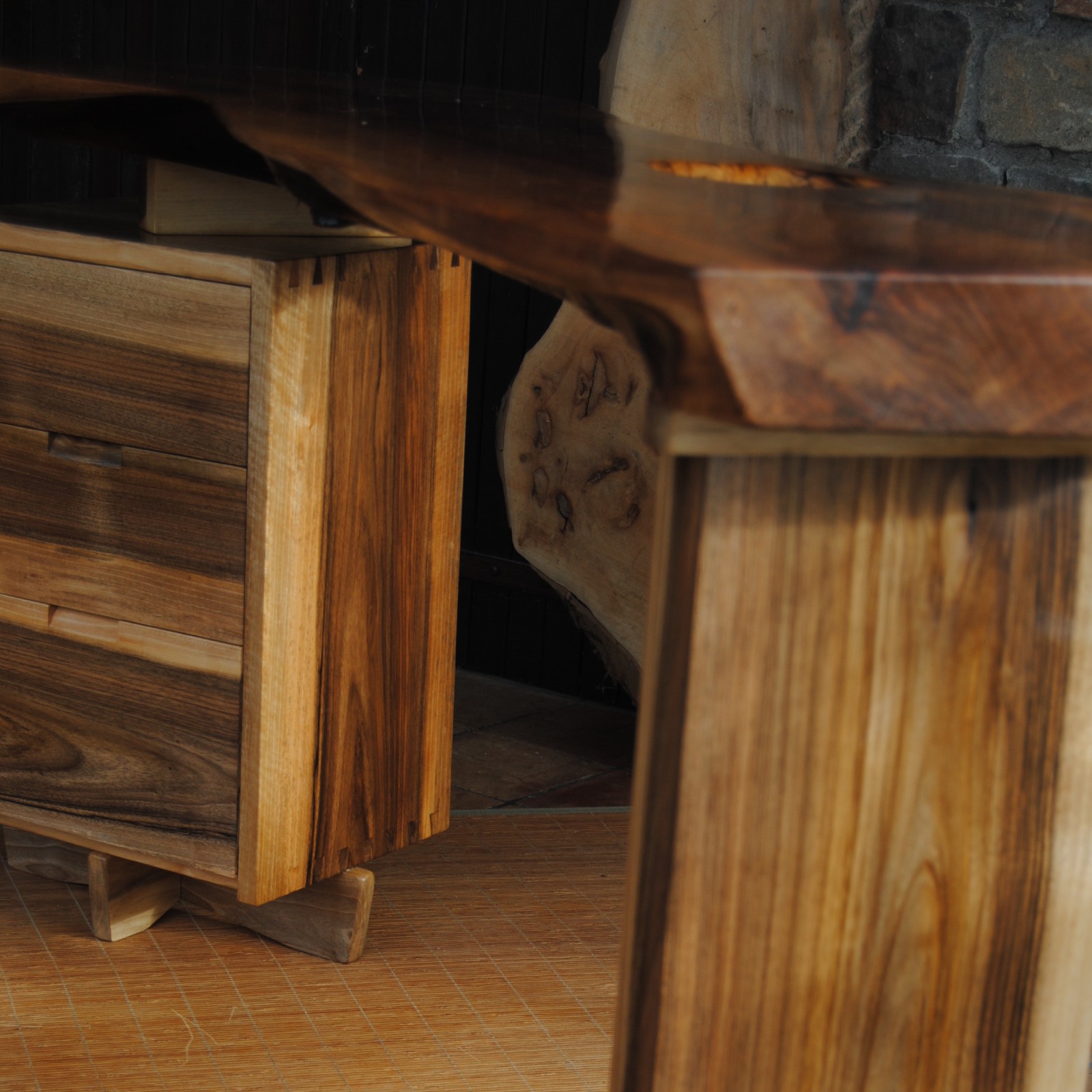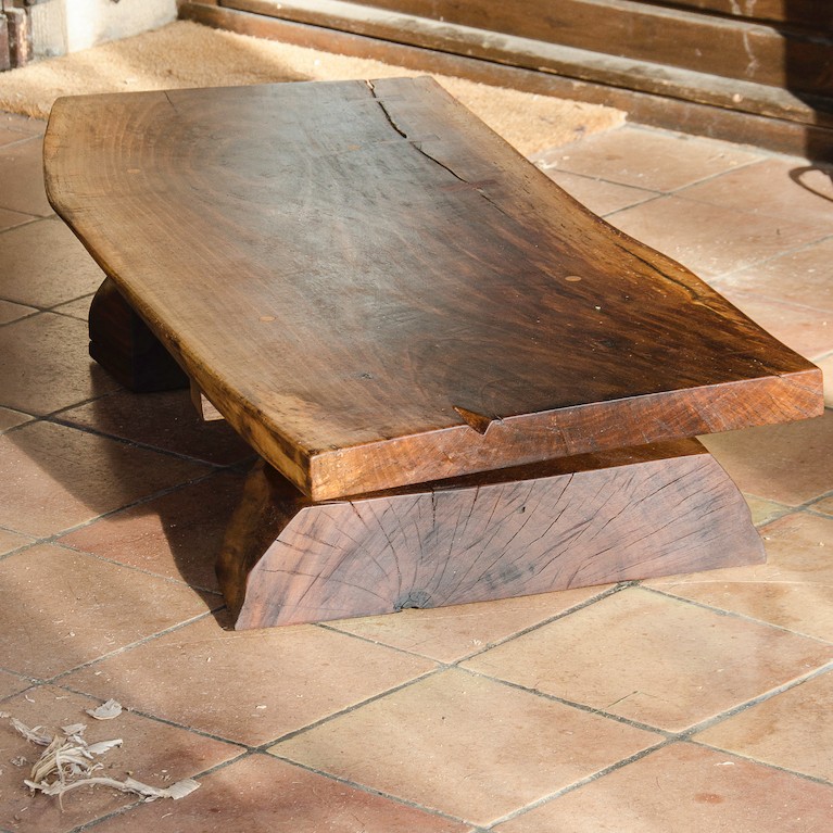 Nos meubles ne sont pas rectilignes, nous gardons ce que d’aucuns appelleront des défauts : noeuds, différences naturelles de teintes, fissures parfois, pour autant que cela n’affecte pas la structure du bois. Nous nous laissons guider par l’esthétique même de la matière.