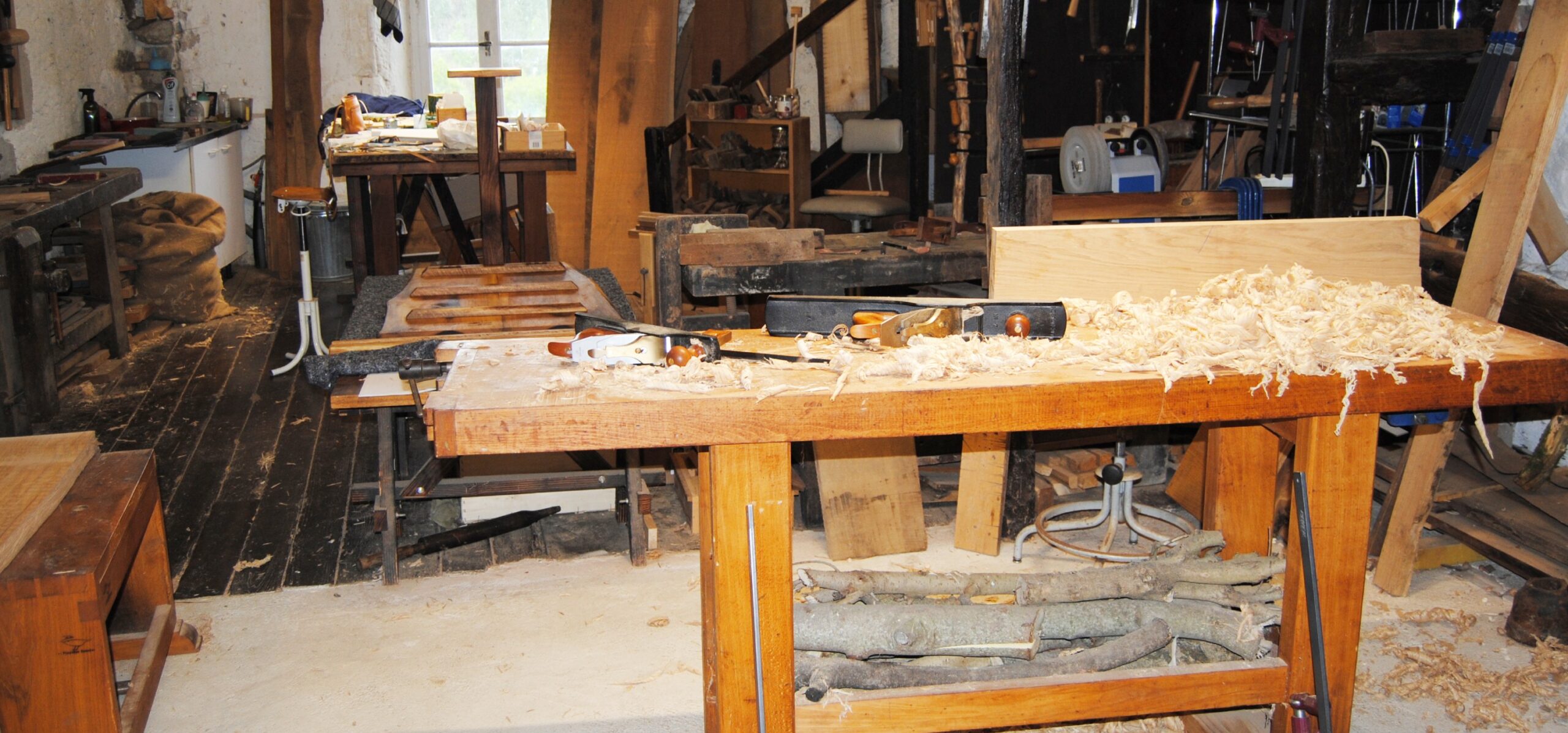 On plane, on rabote, on affûte les scies et les fers, ciseaux et gouges, guimbarde, on sort chignole et vilebrequin, limes et râpes, on fabrique bancs à planer et de chaisier, on utilise du bois sec et du bois vert.